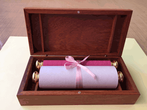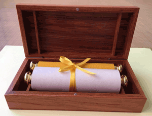 並贈高級紅花梨木製經盒,盒上經題以雷射雕刻印金字,木盒以隱藏式的後鈕及吸鐵式密合開關,方便永久收藏。